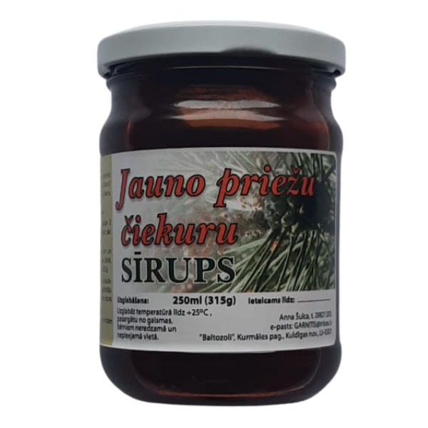 Sastāvs – jauno priežu čiekuru ekstrakts cukura sīrupā – cukurs, ūdens.